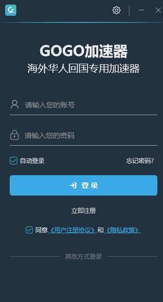 GOGO加速器是一款海外华人回国提供网络加速服务。支持Windows XP/Vista/Win7/Win8/Win10等多种操作系统,多种协议全面支持,多种套餐,不限速度,让用户可以随时随地进行网络加速,一键轻松回国。