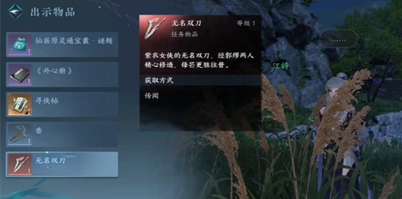 3、完成对话者之后,我们就可以获得到无名双刀,前往到仙原居的位置,把无名双刀出示给NPC;