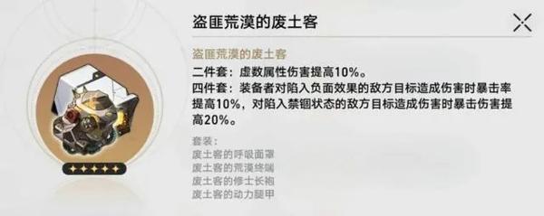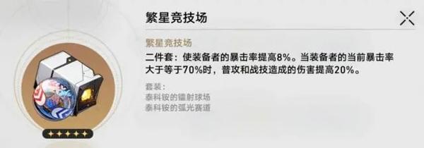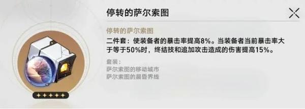 二件套效果:使装备者的暴击率提高8%,当装备者的当前暴击率大于等于70%时,普攻和战技造成的伤害提高20%。
