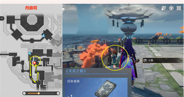 4、然后到【丹鼎司】下图位置,和【小鱼】对完话后获得第3本书《无言之卷》;