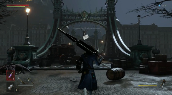 首先来到镇子上,先左转,进入一个废墟,里面有一个无头拿叉子的敌人,击败后往里走。