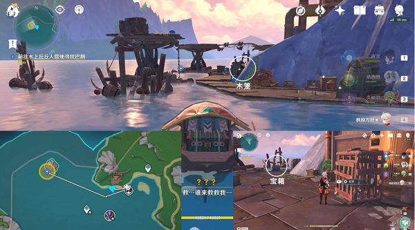 1、接取完成任务后,接着需要驾驶浪船前往海上丘丘人的营地,到达之后需要击败丘丘人并打开木笼;