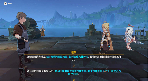 2、之后回到码头与艾古伊进行对话,在对话中得知调节阀的操作方法,随后需要前往梅洛彼得堡附近检修下水道;