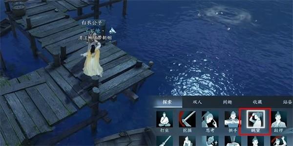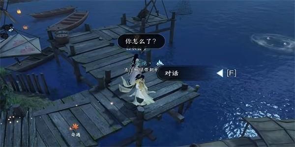 2、走了一段路之后,白衣公子突然停下,需要与其进行对话,并使用表情动作眺望,随后即可完成此项任务。