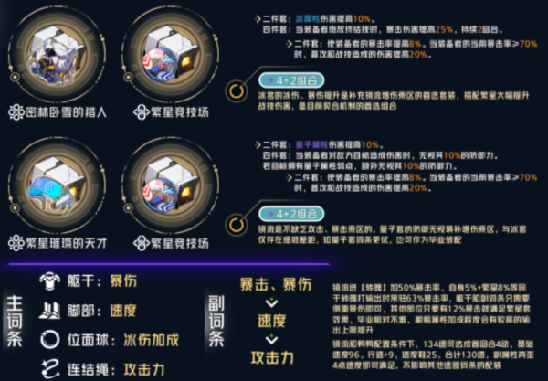 套装首推冰套,提供恰当的冰伤及暴伤加成,补充镜流所需的增伤乘区,其次量子套的无视防御同样收益显著,考虑到效果覆盖方面,配对上可以组银狼协助,有道是主c皆可量子套,与冰套两者间仅存在细微差距,如果有词条更优的量子套,那作为毕业装也完全没问题;