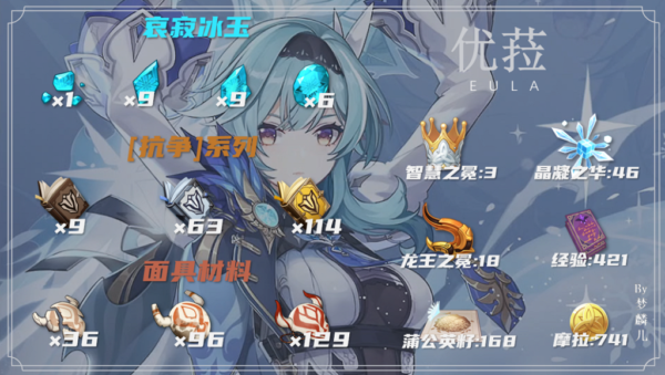 优菈天赋突破材料:“抗争”系列、破损的面具、污秽的面具、不详的面具、龙王之冕和智识之冕;