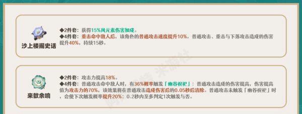 中期过渡可以选择攻击2件(角斗/追忆/辰砂/余响)、风伤2件(沙楼/翠绿)的相互2+2散搭组合;