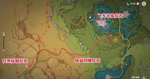 这个世界任务位于琉形蜃境西南角的沙漠区域高山上,通过常规途径难以到达,需要乘坐蔓生溪谷的「呼呼飞车」,沿「黛紫之花」轨道前往,途中还要拾取「轨道幻化石」来切换轨道。下图中红色虚线即为前往路线。