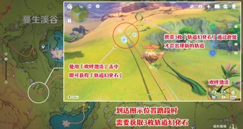 对玩法还不太熟悉的旅行者也可以跟着下面的步骤来。首先来到蔓生溪谷的图示位置,将轨道旋转至「黛紫之花」。