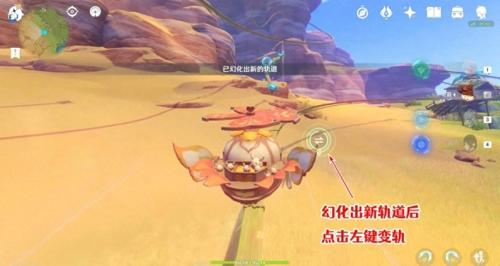 在前往沙漠的途中要注意一点,在呼呼飞车前进道图示位置时,可以看到轨道两侧有三枚「轨道幻化石」。这里我们必须通过呼呼飞车Q、E发射出的「欢呼激流」来获取这三枚「轨道幻化石」,这样在通过「轨道幻化环」时,才会出现新的轨道。