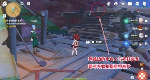 调整好时间后,我们将视角转向北方向,从这里的阶梯上去,可以看到上面有一个光柱,靠近光柱交互即可直接拍摄星空画片。(照片无需保存,只要拍一下即可触发后续剧情)