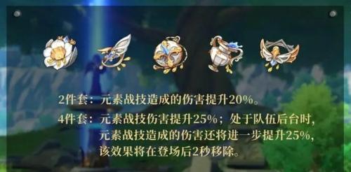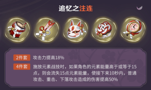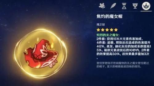 四件套效果:释放技能后,二件套效果提升50%,最多可以叠加到3层,同时与火元素相关的反应伤害会提升40%。